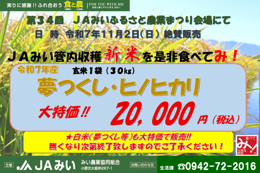 第34回JAみいふるさと農業まつりで管内産米を販売します! 大変お買い得ですので、是非お買い求めください♪