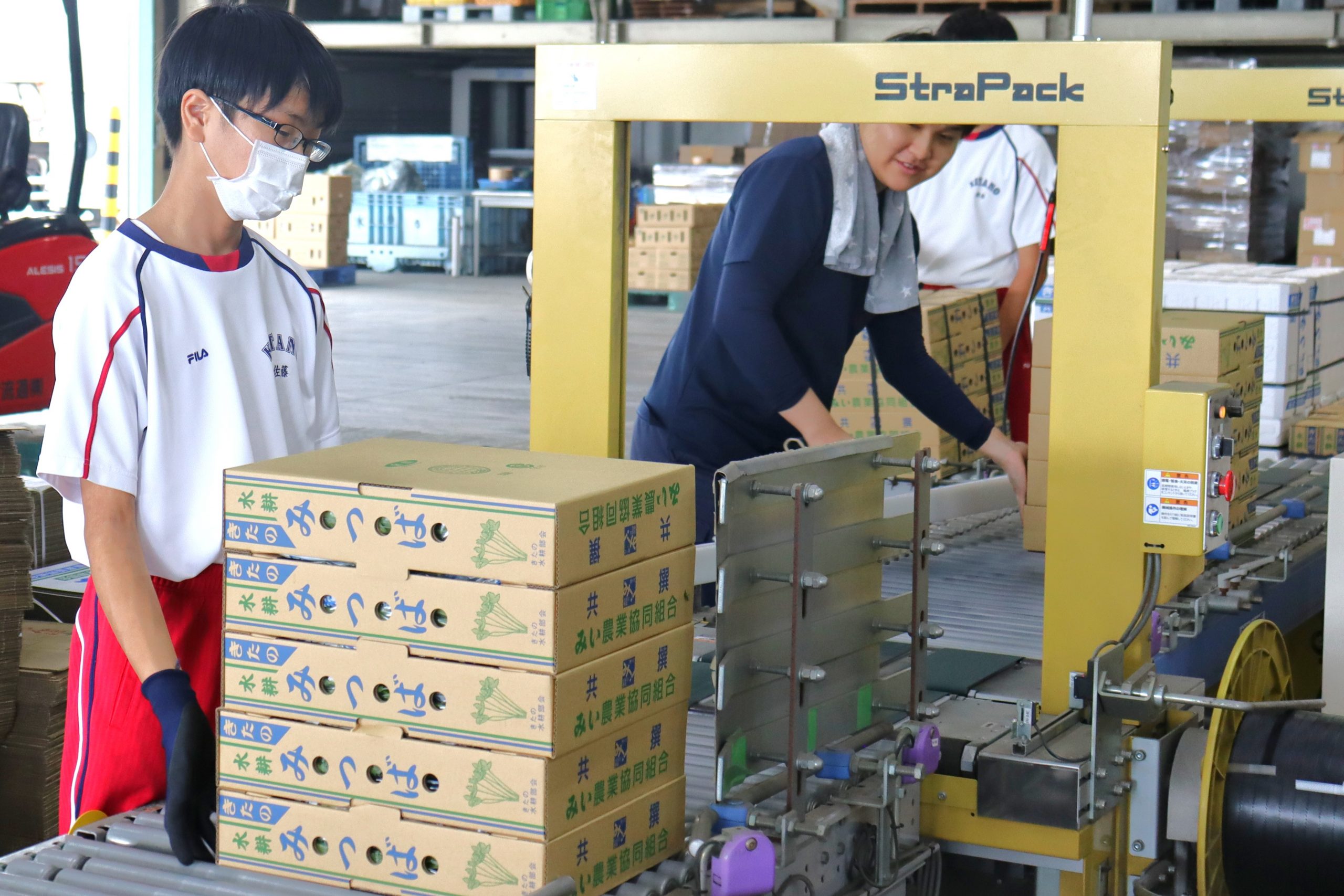 生徒達はセンター2カ所に分かれ、野菜の集荷や調製作業を実習しました。部会員が持ち込んだ野菜の荷降ろし、自動結束機による箱の結束作業、「博多小ねぎ」の袋・箱詰め作業などを体験しました。