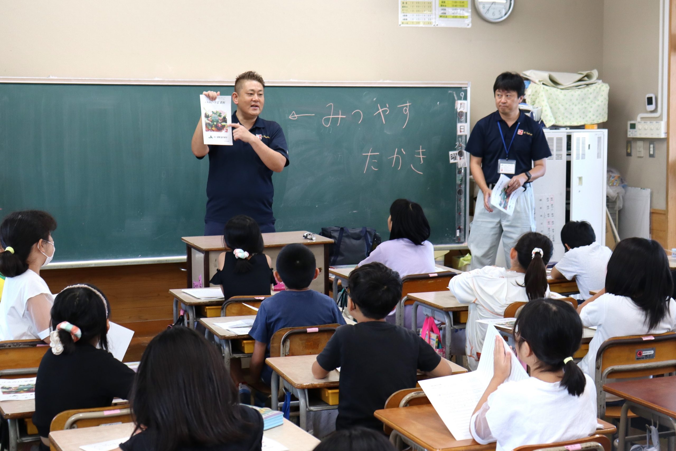 JAみいは9月3日、久留米市立大城小学校で出張授業を行いました。食農教育として地元野菜や農業の大切さ、JAの役割を伝える取り組みで、3年生36名が参加しました。JA職員が講師となり、管内で生産する野菜